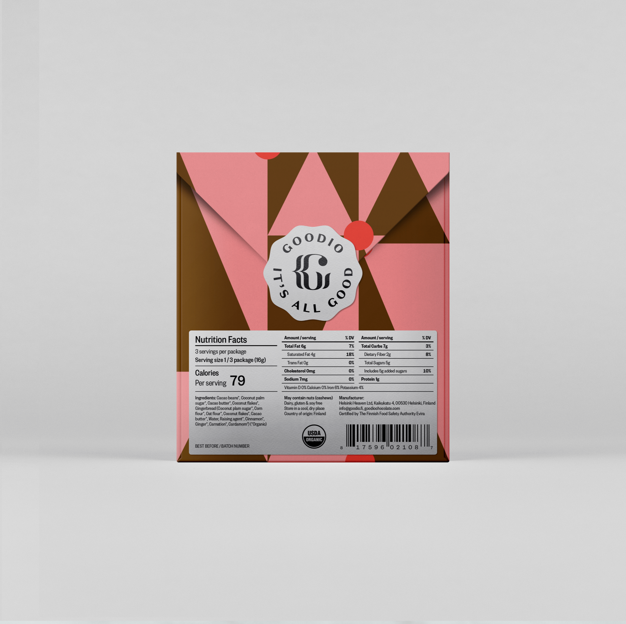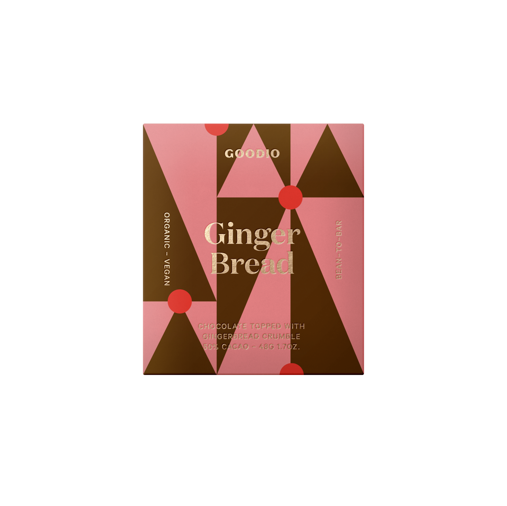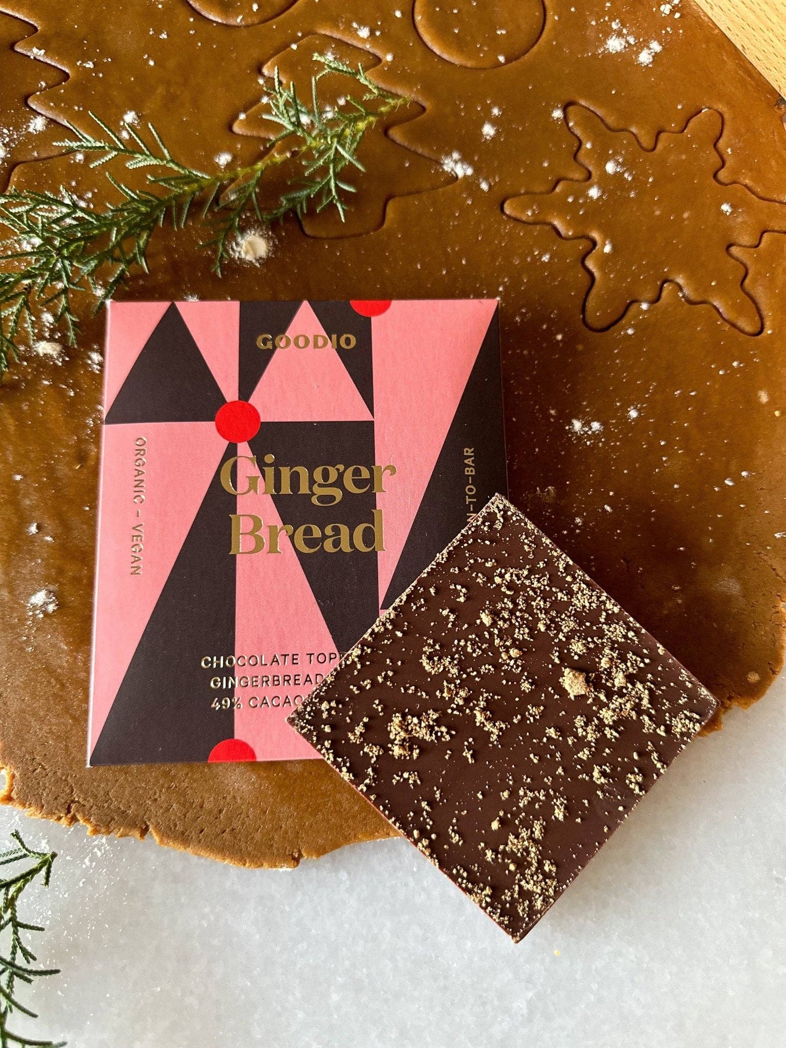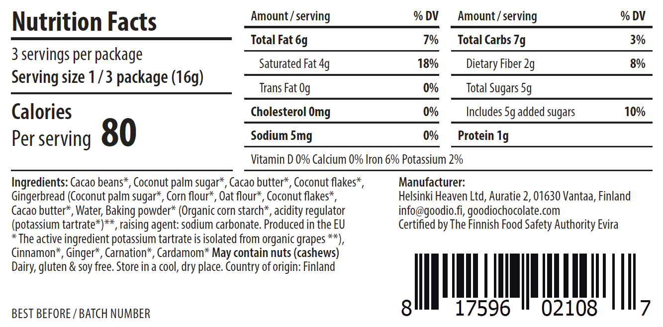We sprinkled the best parts of gingerbread boy onto this fine craft chocolate. Yummy Holidays! INGREDIENTS: Cacao beans*, Coconut palm sugar*, Cacao butter*, Coconut flakes*, Gingerbread (Coconut palm sugar*, Corn Flour*, Oat Flour*, Coconut flakes*, Cacao butter*, Water, Raising agent*, Cinnamon*, Ginger*, Cloves*, Cardamom*). *Organic Chocolate minimum 50% of cacao. Store in a cool, dry place. Vegan, gluten-free and soy-free. May contain nuts: Cashews. This bar is proudly handmade with love in Finland - the happiest country in the world by Goodio Chocolate Artists.