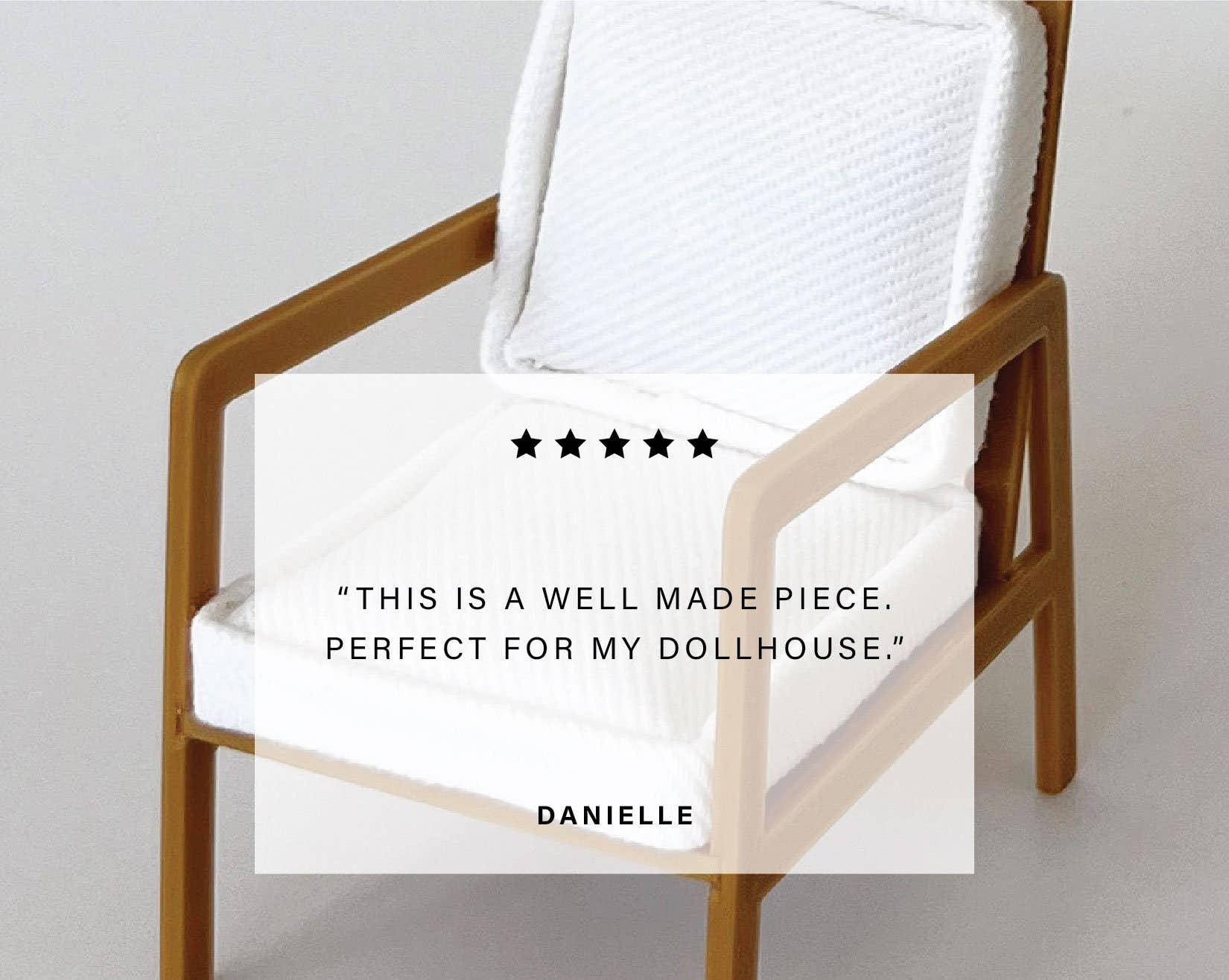 A streamlined frame makes this dollhouse accent chair the perfect accessory for any space. Classic white denim canvas cushions compliment the simplicity of the sleigh-style legs and slat back. A sleek choice for a tiny living room, bedroom, nursery, or outdoor living space.