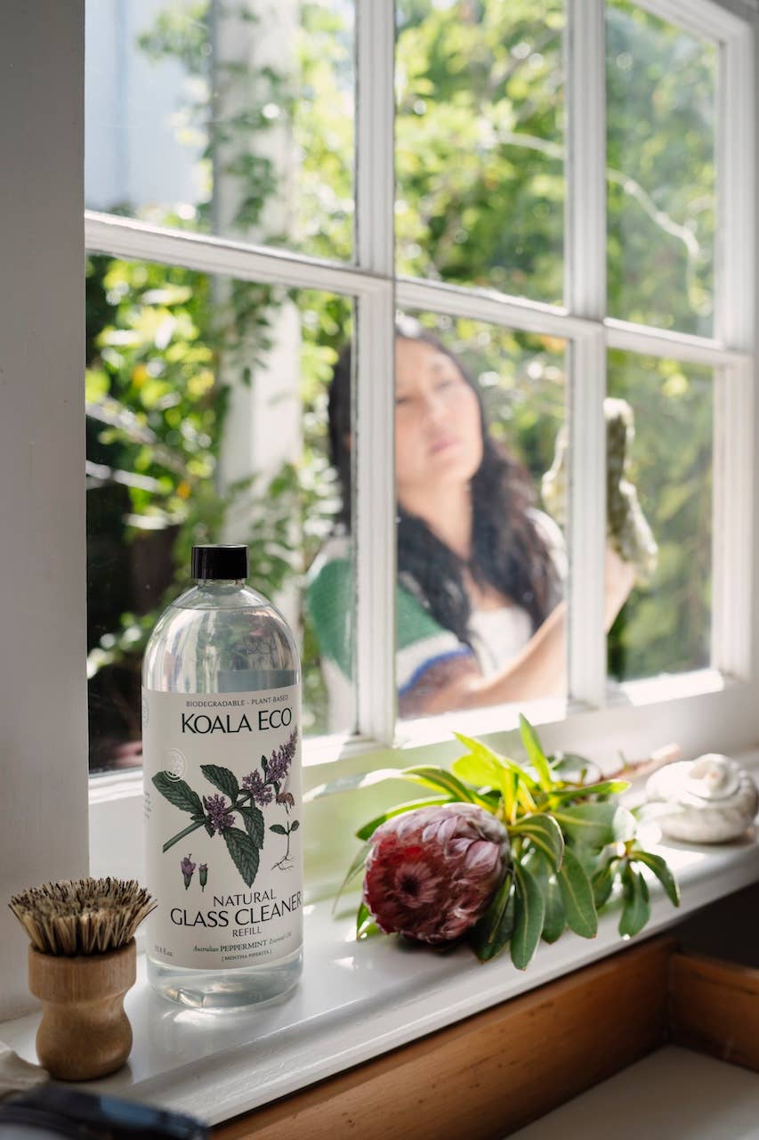 Our Peppermint Glass Cleaner cuts through film and polishes windows, glass doors and mirrors to smear-free perfection while discouraging dust from re-settling. The native peppermint is also a very effective insect deterrent. This biodegradable and eco-friendly plant-based formula effortlessly cleans, removes bacteria and deodorizes, without the need for toxic chemicals.