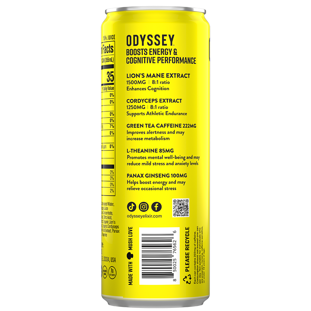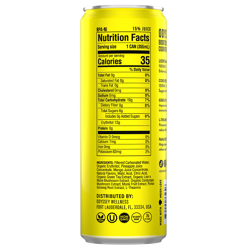 Pineapple Mango is a refreshing blend of ripe pineapple and sweet mango, delivering a smooth, tropical taste in every sip. Made for those who love the Energy + Cognitive benefits of our functional Lion’s Mane and Cordyceps extracts, this sparkling beverage includes 222 mg of stimulating caffeine.