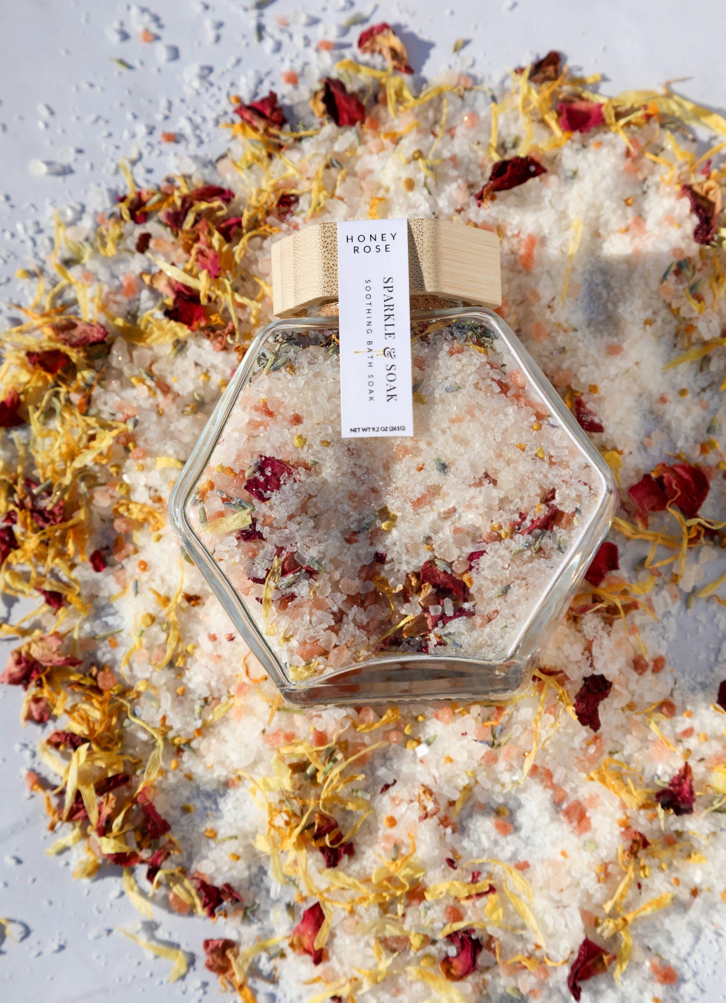 Indulge in the ultimate self-care ritual with Sparkle & Soak: Honey Rose Bath Salts. Presented in an elegant, hive-shaped glass jar with a bamboo cork lid, this 9.2-ounce treasure is as enchanting as it is rejuvenating.