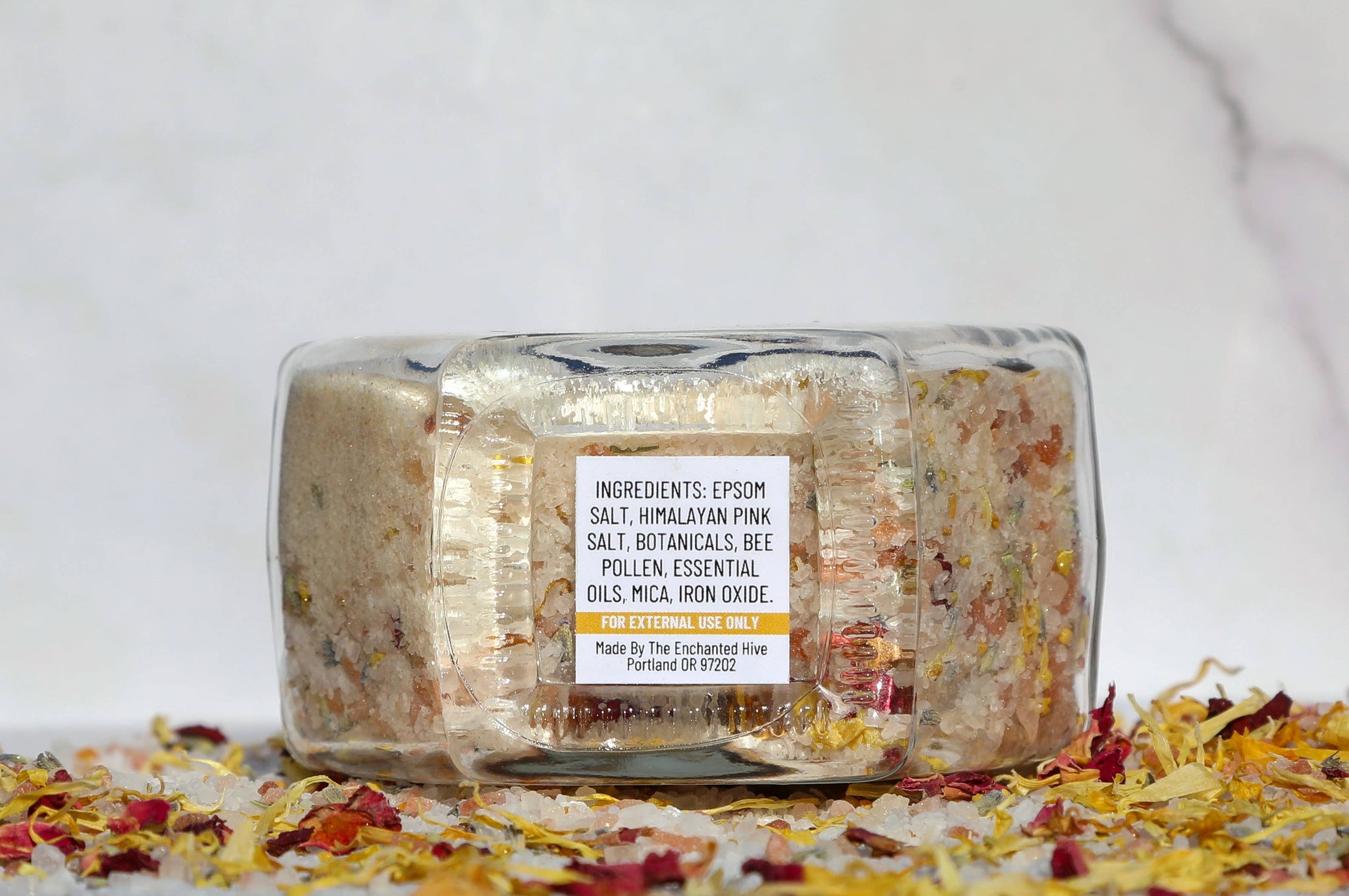 Crafted from a blend of Epsom salt and Himalayan pink salt, this bath soak offers deep relaxation and skin-softening benefits. Rose petals, lavender, calendula, and bee pollen add a touch of botanical bliss, while pure essential oils infuse every bath with soothing aromatherapy. The magic lies in the food-grade mica, creating a sparkling bath experience that delights the senses and nourishes the soul.