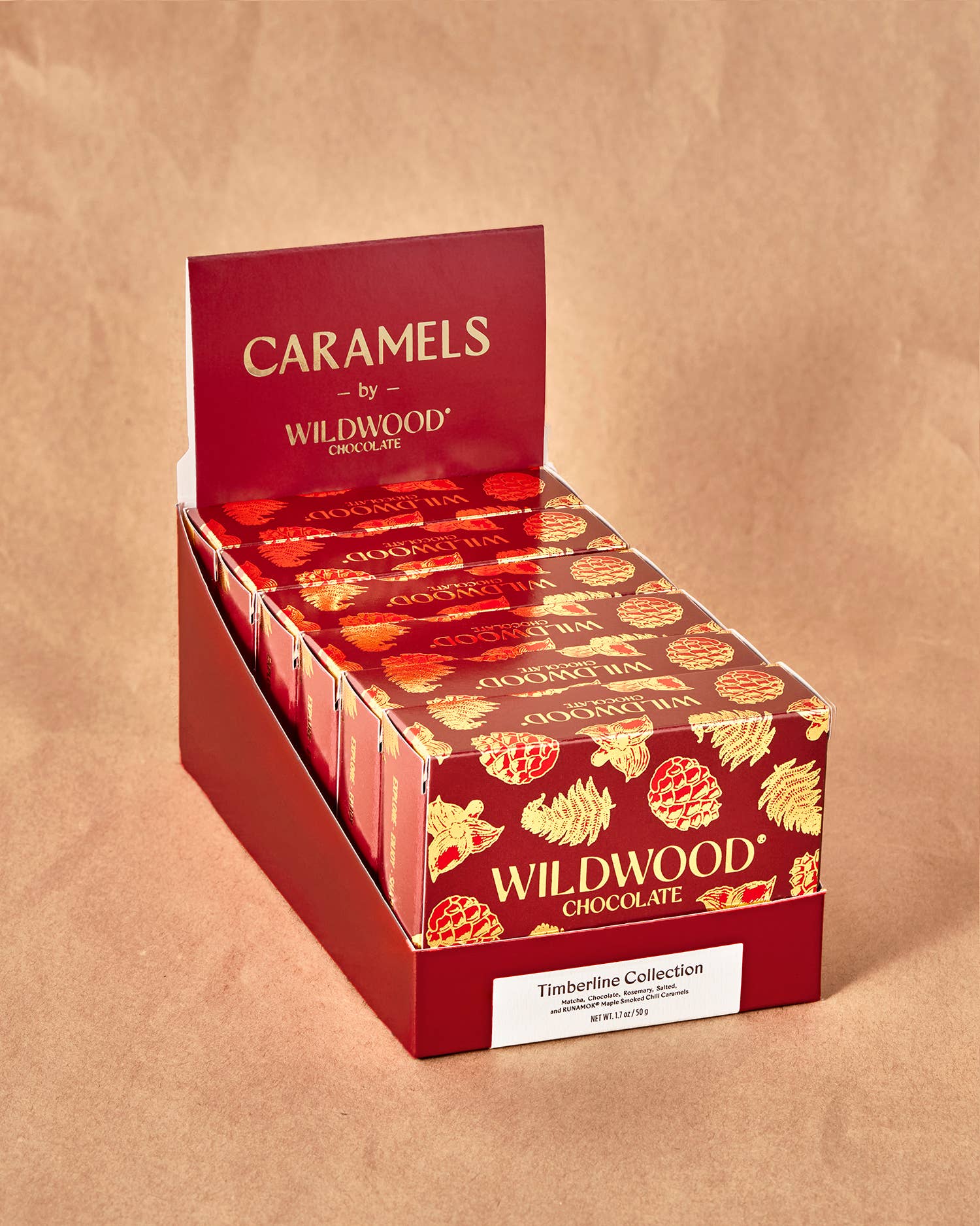 This playful sampler collection of caramel includes our Matcha, Chocolate, Rosemary, Salted and Runamok® Maple Smoked Chili Caramels. Five pieces per box - one piece per flavor. Six Boxes Per Case. Sold by the Case. Compostable wrappers.
