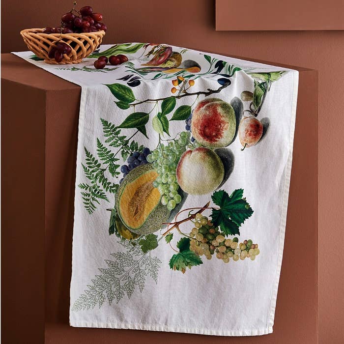 The Abondance D'Automne Natural Tablerunner epitomizes the bounty of the Fall season with its vivid depiction of fruits, vines, and leaves in green, red, and orange hues on a soft cream canvas. Crafted from a blend of cotton and linen (50% linen, 50% cotton), this tablerunner offers a charming touch of autumnal elegance. This printed design was crafted from original artwork, hand-drawn by our in-house team of textile artisans & designers in France. Combining the best qualities of cotton and linen, this fabric blend seamlessly enhances the table with its effortless appearance while providing durability and long-lasting performance. Enhance your dining experience with the Abondance D'Automne Natural Tablerunner, which beautifully captures the spirit of autumn with its vivid depiction of fruits, vines, and leaves, while its cotton-linen blend ensures both durability and sophistication.