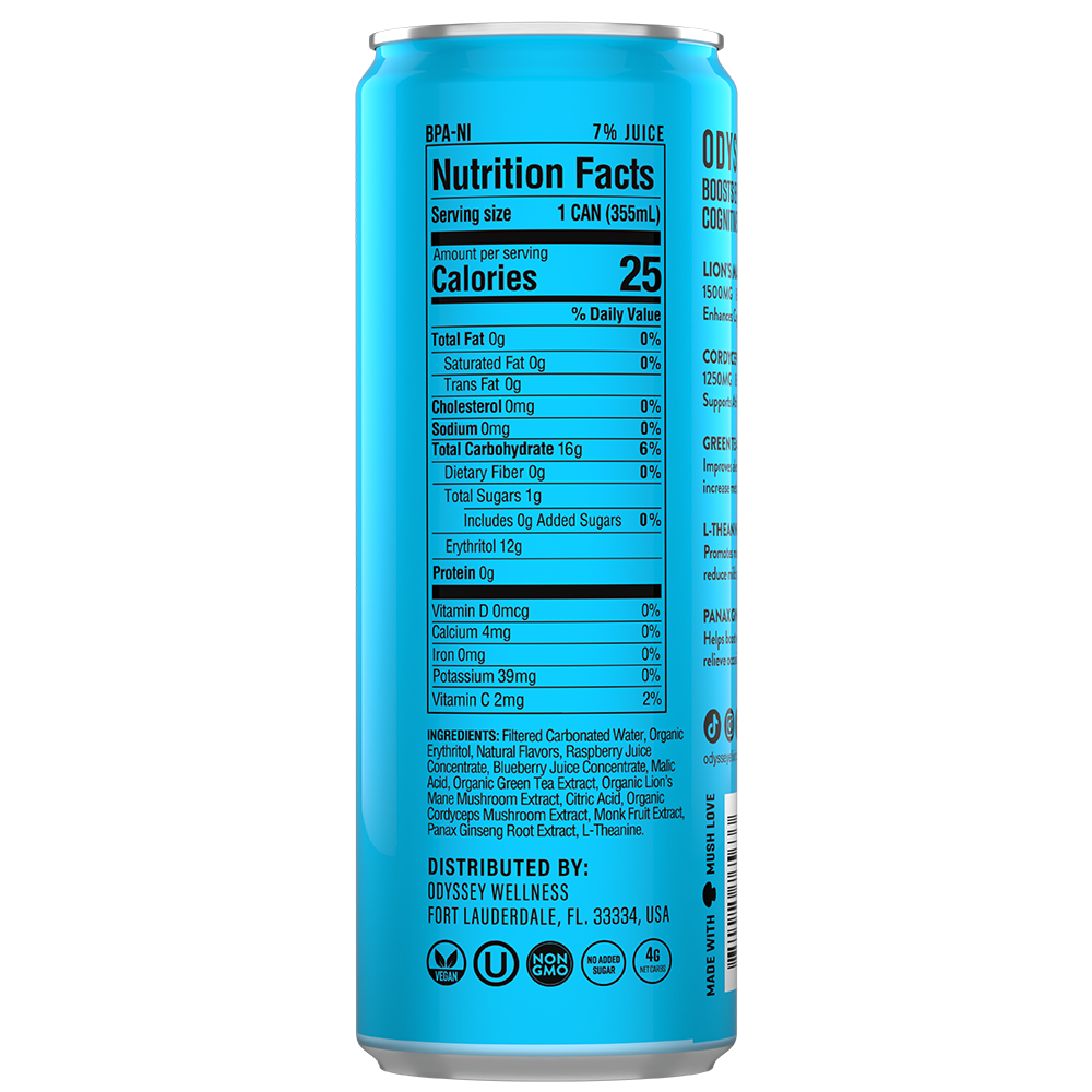 Made for those who love the energy and focus boosting benefits of our functional Lion's Mane and Cordyceps mushrooms, this sparkling elixir includes 222mg of stimulating caffeine.