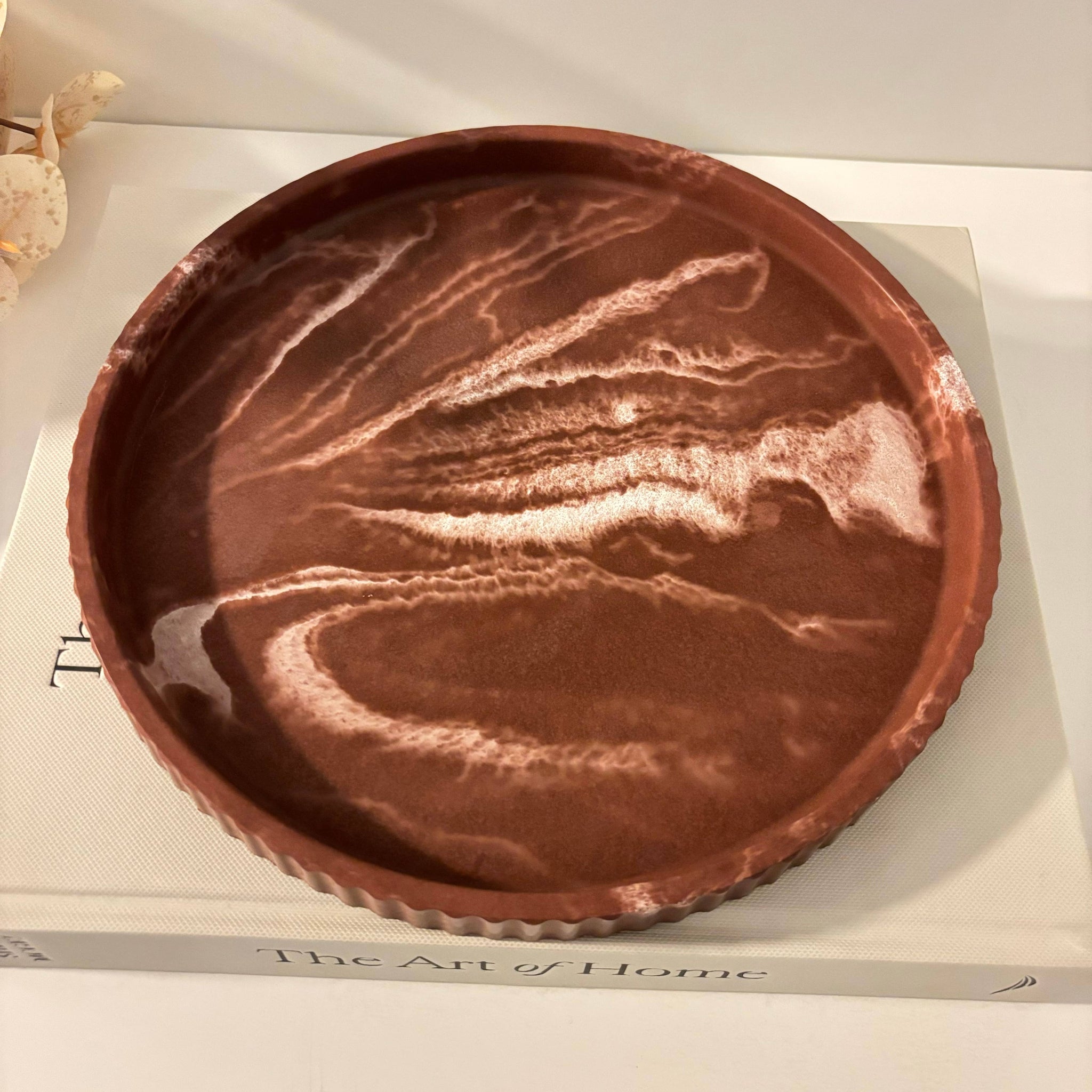 Joma a round fluted tray crafted from concrete, boasting a sleek and modern design. Its smooth surface is accented with delicate fluted edges, adding an elegant touch to any tabletop. Whether used as a centerpiece or accessory, this concrete tray adds a touch of contemporary charm to any space.