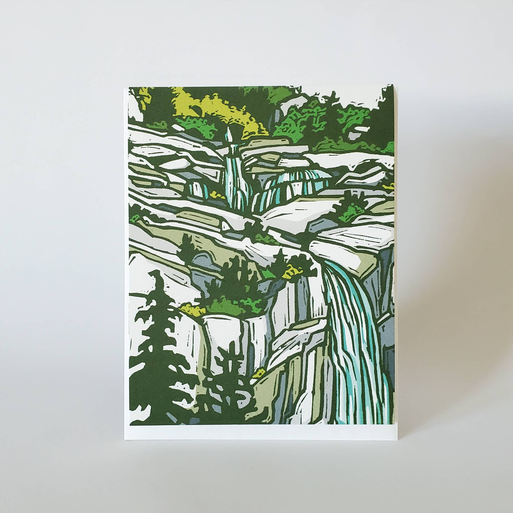 This waterfall mountain landscape makes a versatile note card for any occasion and is a great greeting card option for men. Created from an original block print of the same scene, it fits in well with shops that have an artistic product line, like galleries and museums. It has also sold well in small towns that cater to the nature and outdoor enthusiast. The inside is blank, and each card comes packaged in a protective plastic sleeve or eco plastic-free option. • Size : 4.25” x 5.5” / A2 Envelope • Heavy Felt Weave Paper / 80lb. Cover • 30% Recycled Content / FSC • 100% Recycled Content Matching Envelopes • Blank on the Inside • Packaged in a Protective Plant-based Plastic Sleeve or Eco Sleeve Option Our Values: Fine Art Based Design / Made in the US / Eco-Friendly / Women Owned Business